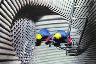 为保障冬季供暖系统安全平稳运行,太原市热力集团热源分公司把握夏季供热设备“体检”最佳时机,全面推进“冬病夏治”供暖维检修。图为8月10日,王家峰热源厂工人们正在进行燃气锅炉炉膛尾部换热器吹灰作业。 李学军 宋卫东 摄