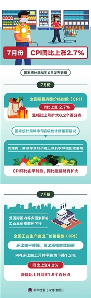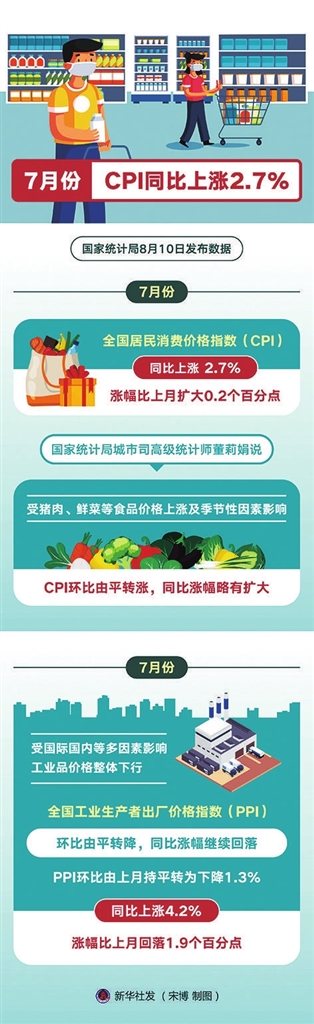 “7月份,受猪肉、鲜菜等食品价格上涨及季节性因素影响,CPI环比由平转涨,同比涨幅略有扩大。”国家统计局城市司高级统计师董莉娟说。