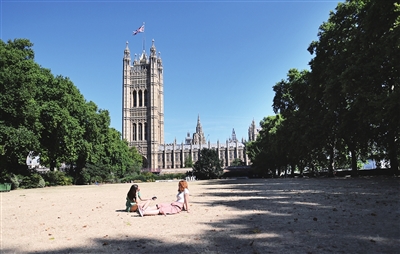 这是8月9日在英国伦敦议会大厦外拍摄的干枯的草地。