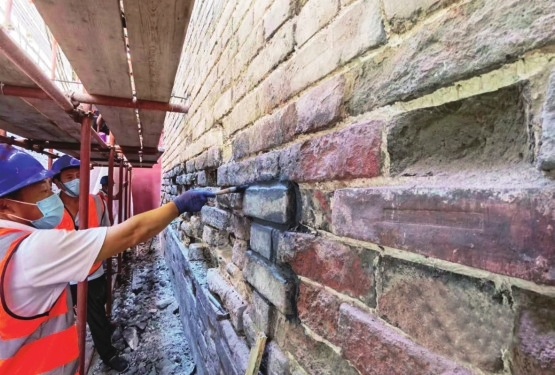 施工现场,工人们还发现了琉璃瓦,以及带有戳记的墙砖。在工人的指引下,记者在南院东墙上找到了一块带有文字戳记的墙砖,上面“嘉靖十四年春季窑户孙明造”的戳记清晰可辨。工人们说,在南院,这样的墙砖有很多。