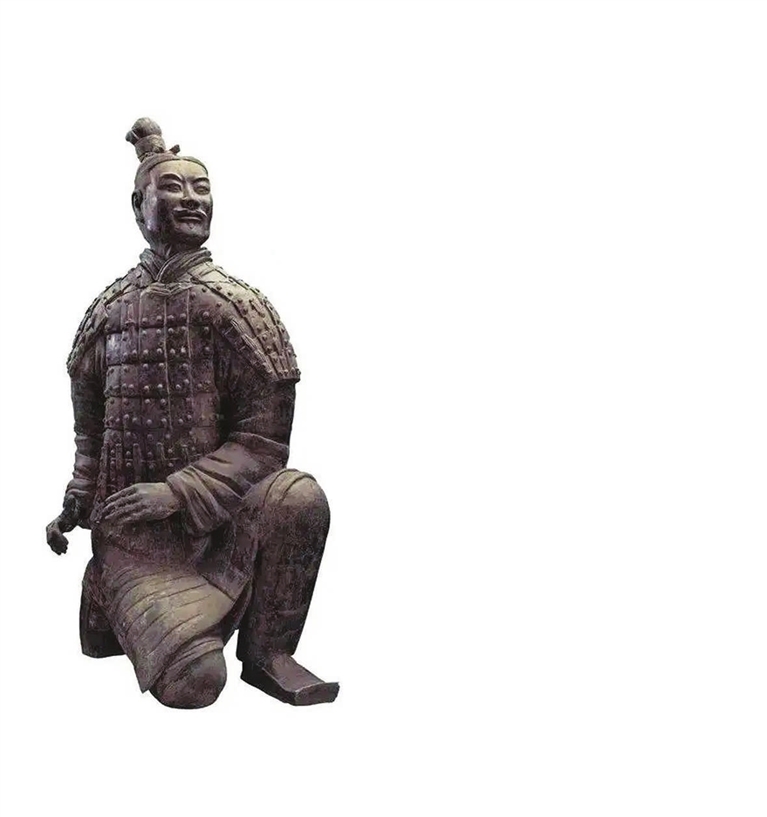 跪射俑身穿战袍,外披铠甲,左腿曲蹲,右膝着地,双手置于身体右侧作握弓弩待发状。所持武器为弓弩,与立射俑一起组成弩兵军阵。跪射俑身穿战袍,外披铠甲,眼神肃穆,展现出了秦代将士之勇猛。