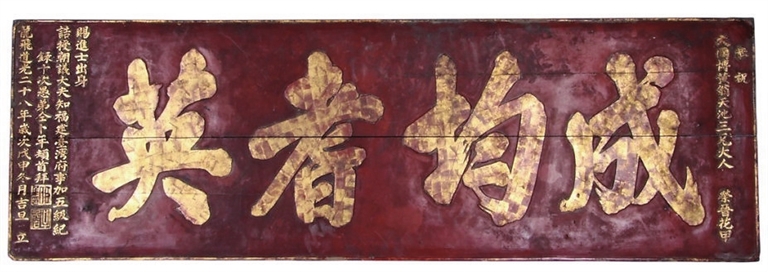 仝卜年对书法亦颇有造诣,虽然存世作品不多,但我们仍可从凤毛麟角中,领略其独特的魅力。现存于厦门市博物馆的一块木匾上,“成均耆英”四个金色大字,便是他的手书墨宝。这是他为老者黄天池题赠的“祝寿匾”,称赞黄德高望重,富有智慧,成就斐然。其笔力遒劲,古朴圆润,具有珍贵的史料价值。