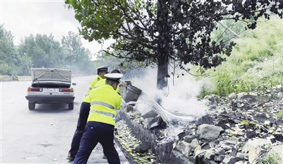 8月11日下午3时50分许,古交市公安局交警大队民警在路上巡逻时,突然看到前方七里沟村路段飘来一股黑烟。“可能着火了……”民警立刻赶到现场,发现路边草丛起火,火势已开始蔓延,着火面积呈扩大态势。见此情形,民警立即停车,拎起车载灭火器扑救,并向周边居民借来几桶水,快速将火扑灭。