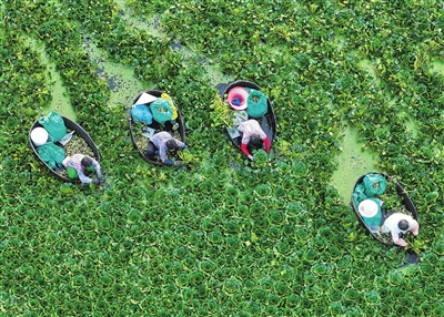 8月13日,江苏省泰州市姜堰区淤溪镇卞庄村村民采摘菱角(无人机照片)。
