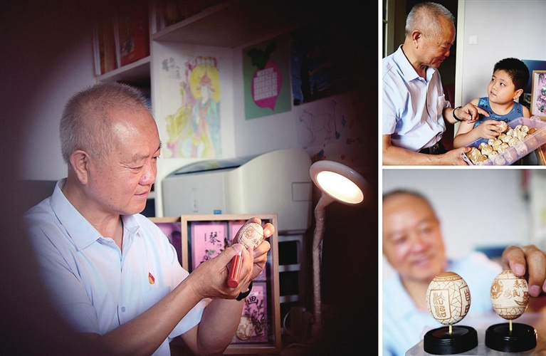 多年来,家住柳巷海西社区的老党员岳利民潜心创作蛋雕作品,丰富退休生活。图为8月16日,岳利民正在精心制作“喜迎党的二十大”系列蛋雕作品,以此来歌颂伟大的党、伟大的祖国。 米国伟 摄