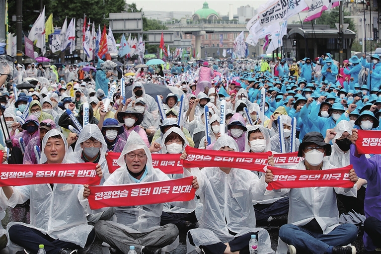 8月13日是韩国光复节小长假首日,当天首尔市中心爆发反美集会,集会者要求中断本月末计划进行的韩美联合军演,并要求“解散韩美同盟,撤走驻韩美军”。据韩国警方估算,当天至少有6000人参加集会,其中大部分为全国民主劳动组合总联盟成员。集会者手持“反对战争演习”“反对美国”等气球或条幅,并高喊“由劳动者来结束韩美战争同盟吧”“这片土地不是美国的战争基地”等口号。