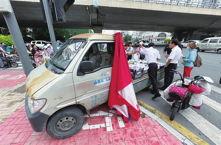 8月21日,省城建设路迎春街口,有货车停放在斑马线上,当街叫卖葡萄,给这一路段的交通造成拥堵。 邓寅明 摄