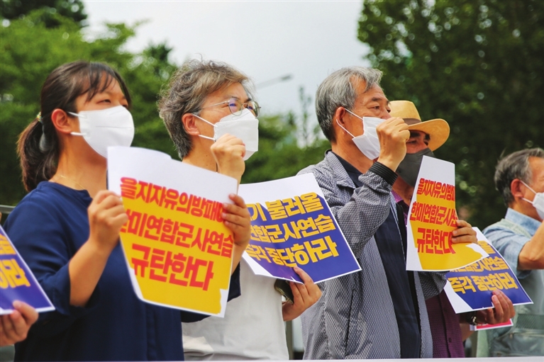 韩国“和平统一开创者”、《6·15共同宣言》韩方实践委员会等多个民间团体当天在战争纪念馆前举行抗议集会,呼吁韩美中断联合军演。