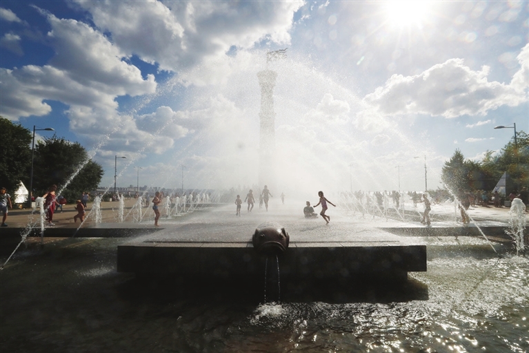 8月20日,人们在俄罗斯圣彼得堡的一处喷泉消暑。 新华社 发