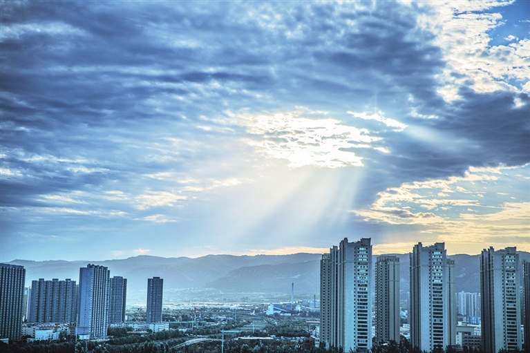 8月23日傍晚,北中环桥附近天空,阳光透过云朵形成一束束光柱照向大地,十分惊艳。 王韵菲 摄
