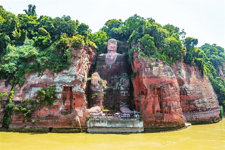 近期,持续高温晴热天气使四川省多地出现不同程度的旱情,长江上游的主要支流岷江、青衣江和大渡河三条水系的上游来水均少于往年同期,导致乐山大佛前方的三江汇流处水位持续降低,部分河床与江滩裸露,乐山大佛罕见露出底座。 新华社 发