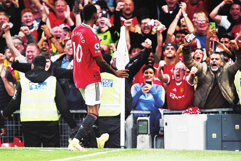 此前两连败、积分垫底,曼联队主帅滕哈格本场比赛破釜沉舟,在首发阵容中弃用C罗、马奎尔、弗雷德等主力。开场后,曼联队三军用命,在奔跑和拼抢积极性上明显强于对手。第15分钟,曼联队左路打出精彩配合,桑乔接小将埃兰加传中后转身抽射破门。下半场开场不久,马夏尔断球后送出直传,拉什福德单刀推射破门,将比分扩大为2比0。尽管利物浦队此后由萨拉赫在第81分钟追回一球,但无力改变结果,曼联队主场2比1拿下赛季首胜。