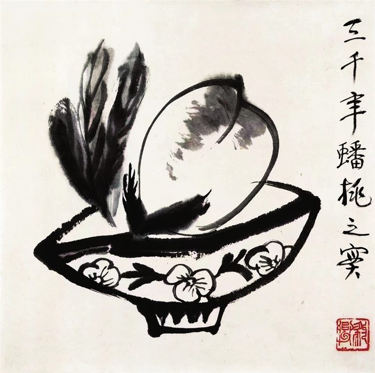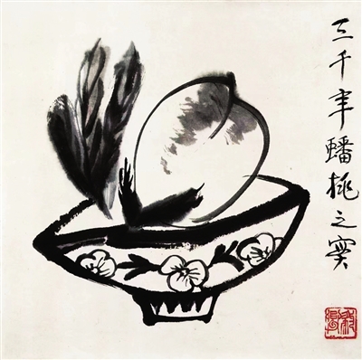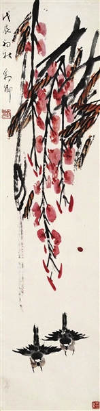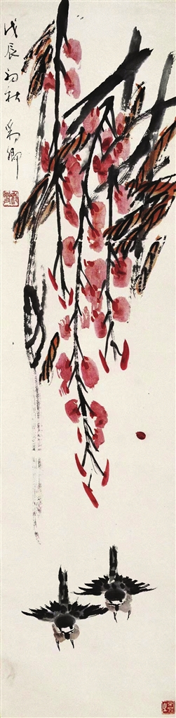 朱豹卿画面的形与色很纯粹,一笔一画自如,又得天趣生拙之美,这其中他也吸收如潘天寿先生的形色感观和画面品质雄强硬朗气息,也吸纳了吴昌硕先生花鸟画中在用笔上的格致,率真之气扑面而来,那一枝花,一双蝶,一尾鱼,万般物理,化为纸上生灵,凸显勃勃生机,气象如虹,笔墨浑然天成。作品《紫藤双雀》,竖式,两只雀身正面飞来,少见,那上方的紫藤花赋予节奏感,行笔的速度快慢粗细,相交合理,不求平稳而是鲜活呈现,紫藤的用色温雅与叶面的拙率成为画面里的矛盾体,有意趣。作品《虫》《石榴》《乡土》《慈》《三千年蟠桃》《葡萄》《寿者之相》趣味小品画,其韵味十足,其中《虫》的构思和笔墨表达生涩,那昆虫,笔笔写出,有意思,与荷花与荷秆的关系颇具对照感,简款简印,只见笔墨,行色清雅。