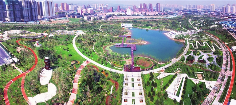 和平公园整体就像一条大鱼,而中心湖泊就位于这条大鱼的“鱼肚”处。水是这座公园的点睛之笔,公园整体布局通过堆山造湖的设计构想,在低凹处创造中心湖泊,形成公园的景观核心,景观湖区域的面积达到2.5万平方米,并通过独特的“叠瀑”设计,让水“活”了起来。