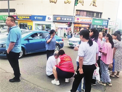 8月24日下午4时,西矿街北社区网格员林红(左三)巡查至西矿街与西铭路交叉口时,突然看到一位老人摔倒在地,满脸是血。林红赶紧跑过去,因为力气小,搀扶起来颇为吃力。见状,路人纷纷过来帮忙,并到旁边的西山商厦找到其女儿。很快,老人的家人急匆匆赶到现场,大家一起将老人扶到车上,去往附近医院就诊。 韩睿 焦馨 摄