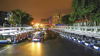 停运6年的尖草坪电车停保场重新投入使用,成为830路、845路、S18路公交车的起点站,又一次“回归”到服务市民出行的行列。 图为8月28日凌晨,即将驶出新场的公交车。 张昊宇 摄