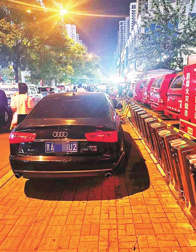 拍摄经过:8月26日晚,千峰南路与沙沟南街交叉口西北角,一辆黑色奥迪轿车横停在公共自行车租赁点内,将七八个锁桩堵得严严实实,导致市民无法还车。希望交警部门加大巡查力度,也希望大家共同抵制这种交通违法行为。