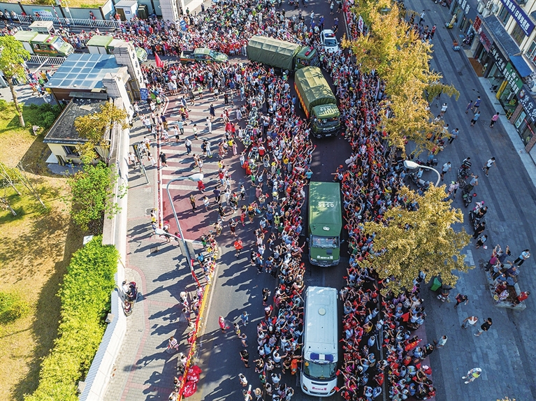 下山路两边站满了送行的群众。队伍里有佝偻着背的八旬老人,有牙牙学语的孩童,人们带着矿泉水、牛奶、糕点、水果和鲜花,翘首盼望英雄的身影。