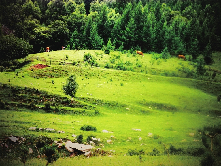 绿,覆盖了整个山脉。骑马上山,浓荫蔽日的云杉林把山路遮掩得密不透风,山的远处呈现出一线绿色的山顶,像极了镶嵌在蓝天里的一幅图画。登顶极目远眺,心情豁然开朗。信步走在松软的天然草坪上,远看连绵起伏的群山,层峦叠翠的林带,朵朵白云飘浮在天空,离我们很近,让人真真切切地感到云就在头顶,好想摘一朵献给我热爱的人。山顶上生长着各种各样的小草,矮矮地匍匐在属于它们的领地,五颜六色的野花点缀着整个山峦。起伏平缓的山坡绵延数十里,草坪边缘,松树林和云杉林守卫着这里的风花雪月。浅绿色的草、深绿色的林和草地上三五成群的牛和马,构成了一幅静中有动的田园风景画。徜徉在美景中,漫步在油画里,或躺在软软的草丛里,听鸟语,闻花香,看白云,望蓝天,或支一顶帐篷,摆上自己喜欢的香茶,任山风吹乱你满头的秀发,温情随清风在山谷里飘荡。那感觉,犹如闯入仙境。