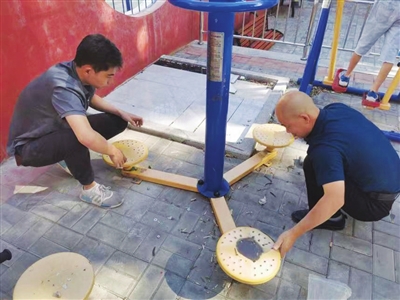 上马街二社区所辖一些小区的休闲设施使用频率高,缺乏维护,出现不同程度损坏,存在一定安全隐患。为此,社区工作人员对这些小区的休闲设施进行排查登记,8月29日,社区找来维修工人,对上马街6号院、11号院里出现问题的休闲座椅和健身器材进行维修,消除隐患,保障了居民安全。 郭晓华 陈曦 摄