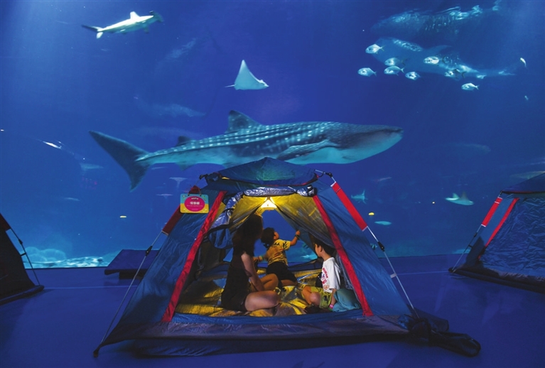 8月27日,体验者在珠海长隆海洋王国鲸鲨馆搭帐篷夜宿,在鲸鲨保育专家的科普中增长知识,近距离体验与鲸鲨等海洋生物同眠的奇妙之夜,感受人与自然和谐相处,传递生态保护理念。