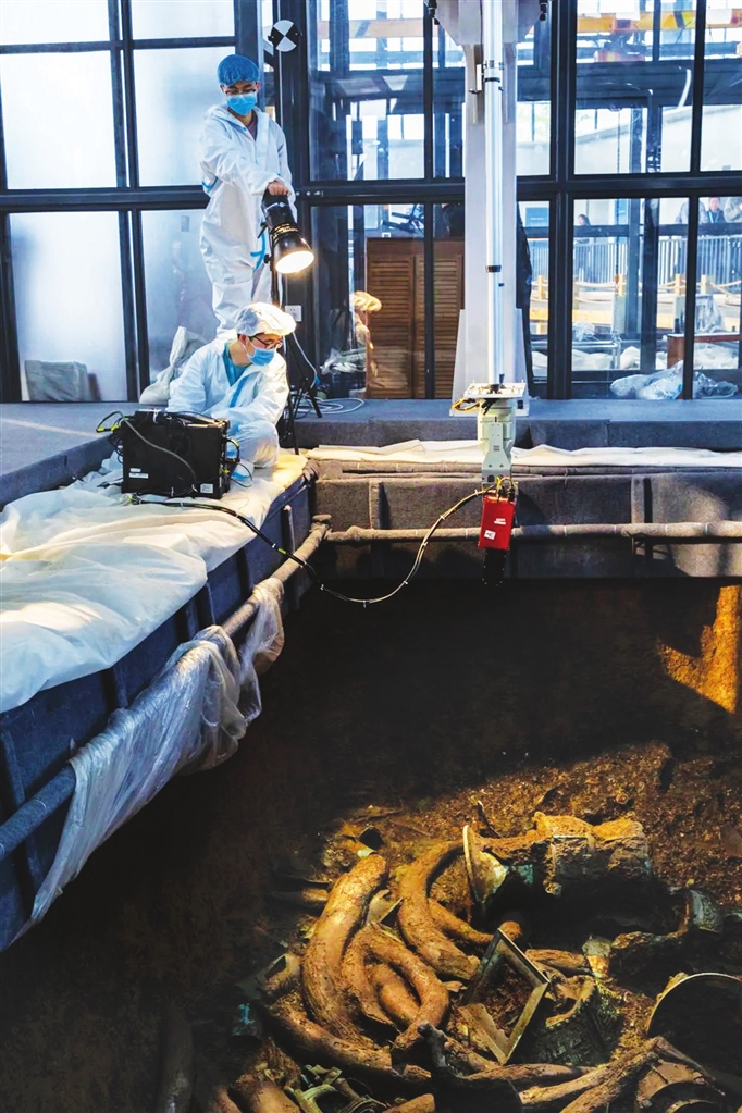 时间到了2022年,当得知将要公布新一轮的考古发现时,我感到很兴奋,因为之前几轮考古发现都集中在3到6号“祭祀坑”,7号和8号“祭祀坑”始终像是个谜。尤其是8号“祭祀坑”,是这6个坑中最大的一个,其中到底还藏着怎样的稀世珍宝,对我的想象力是一个巨大的刺激与挑战。几经周折,终于得到了提前进入考古大棚拍摄的权限。
