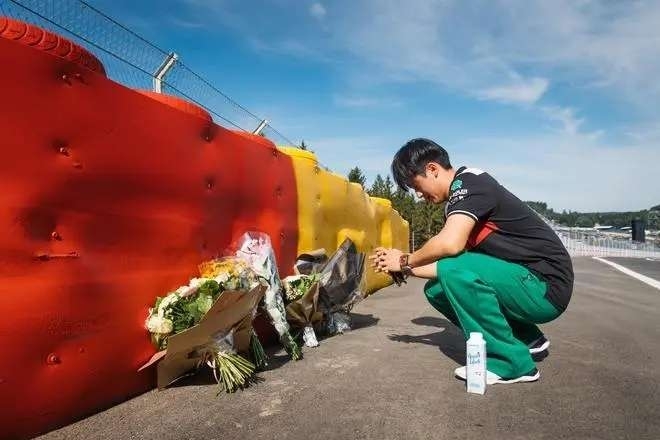 练习赛前例行的走赛道环节里,周冠宇特意在一处摆放有几束鲜花的轮胎墙前停下,随后他慢慢蹲下,闭上眼虔诚祈祷了几句……2019年9月的F2比利时站中,当时和“中国周”同场竞技的法国车手于贝尔,正是在这条赛道遭遇严重事故,不幸离开人世。