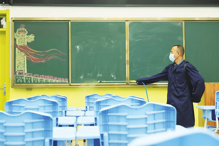 8月30日,尖草坪区实验小学内,工作人员正在对教室、图书馆、走廊等公共区域进行防疫消杀,助力学校疫情防控工作。 张昊宇 摄