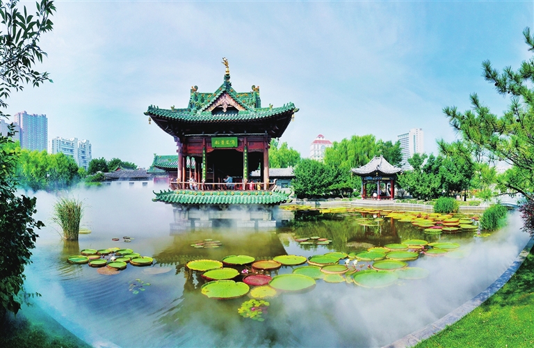 9月4日,迎泽公园泽众书院内朵朵王莲相继绽放,花朵绚丽优雅,奇特的盘叶生机勃勃。 记者 米国伟 摄
