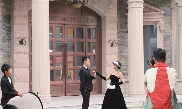 9月3日,在省城钟楼街开化市,一对对情侣踏着初秋微风,在摄影师的镜头下,留下一幅幅街拍特色婚纱照。 张昊宇 摄