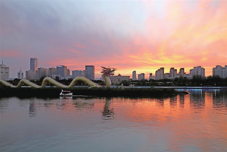 9月4日傍晚,太阳余晖染红了汾河两岸,火烧云布满整个天空,形成了一道美丽的风景。张昊宇 摄