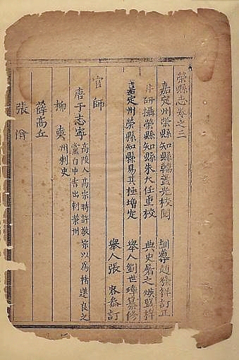 康熙《荣县志》卷端题名反映出主修与主纂者的责任:“嘉定州荣县知县韩荩光校阅,井研摄荣县知县朱大任重校,嘉定州荣县知县易其极增定”,另有“训导赵发祥订正,典史屠之煐监梓”。具体编纂者有:“举人刘世璋纂修,举人刘容参订”。