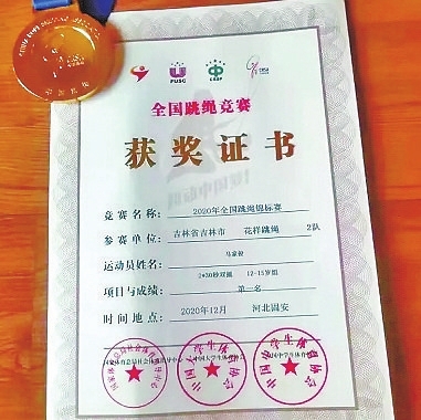 2019年,马家俊获得了人生中第一个全国级别跳绳比赛冠军。2020年,他更是一举拿下了全国跳绳总决赛的连续三摇跳冠军、个人花样冠军和30秒单摇冠军。