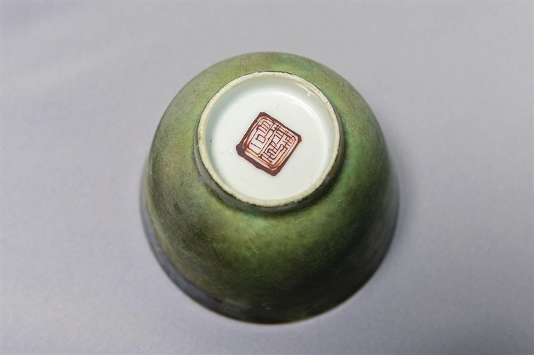 小心翼翼地托起一只清同治景德镇窑绿釉杯,翟杨称这件文物可以被命名为“001”号。绿釉杯小巧玲珑,底部有矾红彩书“同治年制”篆书款识。翟杨表示,这件出水文物的底款,对于长江口二号古船的年代判定起到了重要作用。