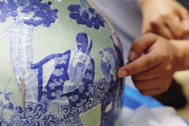 水下考古队伍还发现了一只体形硕大的清同治景德镇窑豆青地堆白青花松下高士图双耳瓶。这个瓷瓶高达60厘米,丰肩鼓腹,两侧有双狮耳饰,瓶身上以青花绘有松下高士图。专家解读称,这种款式流行于晚清民国时期,多用于陪嫁妆奁,民间俗称“嫁妆瓶”。令人惊喜的是,当考古人员一层层清理和收集瓶身里面厚厚的淤泥,准备用于今后进一步研究时,从“嫁妆瓶”里又连续取出了共计50只青花团龙纹杯。