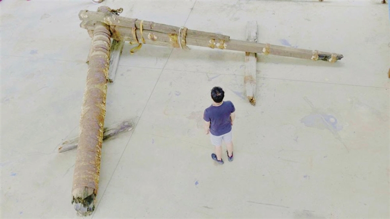 长江口二号古船船舵的舵杆,残长约5.6米、直径42厘米,上面还包裹着52道宽约7厘米的铁箍,推断是为了加固舵杆。舵柄则由铁箍合围3根木材而成,最长处达6.26米。此外,长江口二号古船的铁锚为四爪锚,长约3.3米(不含铁环),亦是目前国内发现较大的古代四爪铁锚。