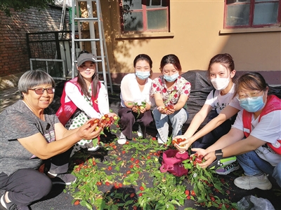 居民宋建军是院里的“打枣能手”,他用长长的竹竿勾住长满红枣的树枝,七摇八晃,红枣便像下雨一样噼里啪啦地掉在网布上。阿姨大姐们说笑着捡拾起网布上的枣,咬一口,脆香!