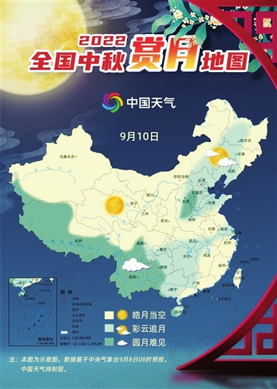 从中国天气网推出的2022全国赏月地图来看,今年中秋节当天(9月10日),西北地区和东南沿海赏月天气条件较好,新疆、青海、甘肃、宁夏、陕西、内蒙古中西部及苏皖北部、浙江南部、福建、广东东部等地都将是皓月当空,能够清晰地看到天空中“白玉盘”般的圆月。