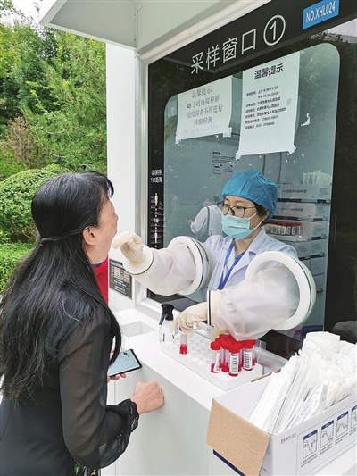 “要是工作日,我出门还得再早些。因为那个采样亭周边的机关单位多,很多人习惯上班前顺便做个核酸。今天是休息日,又是中秋节,做核酸的人应该不多。”牛建芳路上说。果然,8时10分,我们到达采样亭后,周边除了几位刚结束晨练的老人外,并没有人等着做核酸。