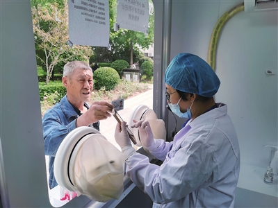 拿出钥匙打开门,我们进入采样亭,牛建芳穿上自己的护士服,戴上医用口罩、手套和头套。在她的指导下,记者穿上一套一次性隔离衣。“自从有了采样亭,采集核酸样本就不用再穿密不透风的防护服了。”说起之前整天穿着防护服工作的场景,牛建芳连连摇头。既闷又热,还不透气,不管是夏天还是冬天,只要穿着防护服,里面的衣服永远是湿的。“特别是冬天,工作时里面闷得出汗,脱了防护服,风一吹,冻得直发抖。”牛建芳说。
