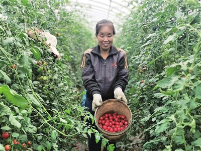 走进村东南大棚种植技术引进试验基地,眼前,蔬菜种植大棚依次排开,村民们正忙着干活。入秋后,天气转凉,大棚内,却是一派热闹的场景:一株株小西红柿苗长势喜人,红润饱满的小西红柿像一盏盏红灯笼挂在枝头,惹人爱。村民王玉梅正蹲在地里摘果,见到记者连忙招呼:“看!俺们种的小西红柿又沙又甜,炒菜、当水果都好吃。”她说,这些“红果果”可是村民们眼中的宝贝,仅靠种植小西红柿一项,她家每年收入达2万元。她身旁的村民蔡慧艳笑着接话道:“俺去年挣了8000元,今年也能挣到1万元哩。”