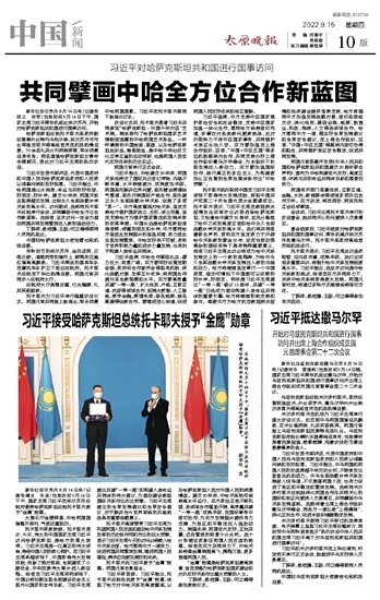仲秋时节的努尔苏丹,金风送爽,云卷云舒。道路两旁的旗杆上,鲜艳的五星红旗高高飘扬。习近平乘坐的国宾车队在摩托车队护卫下抵达总统府。托卡耶夫总统在下车处热情迎接。两国元首共同步入总统府大厅。
