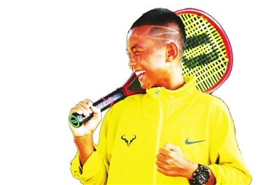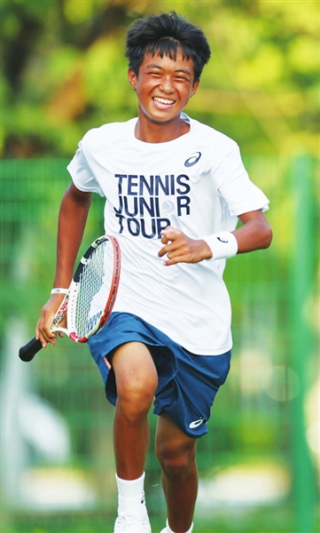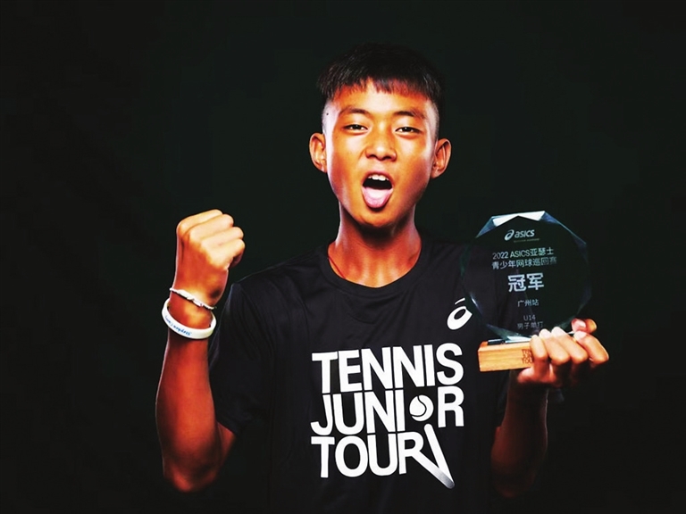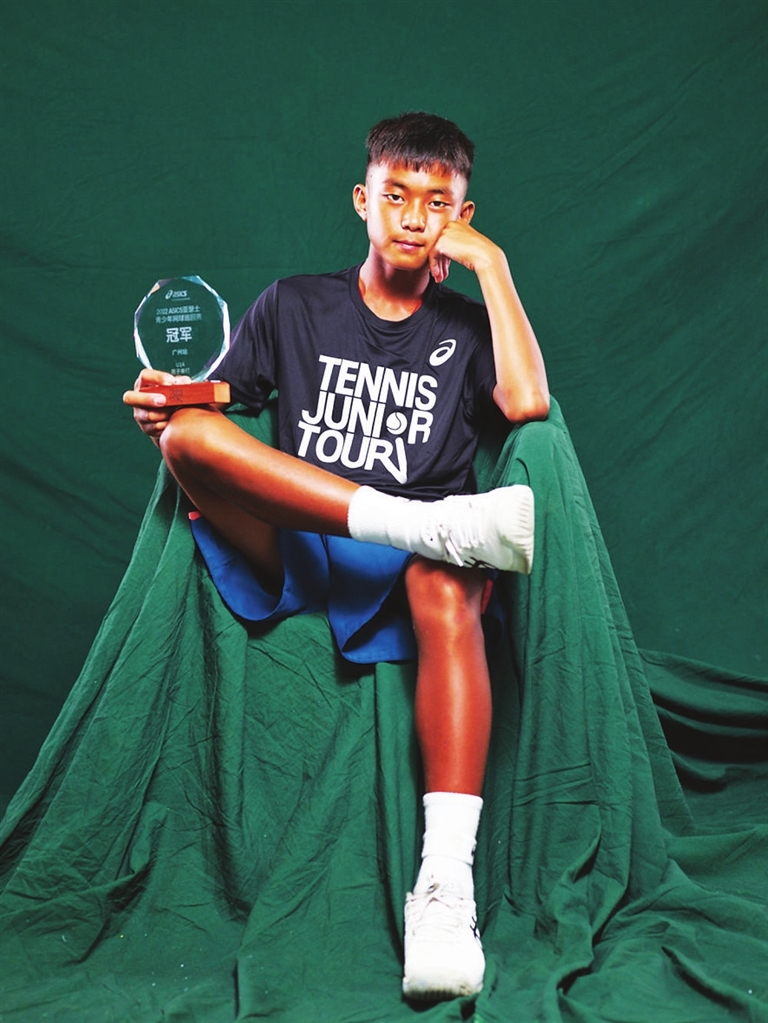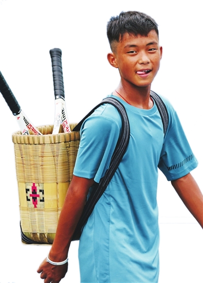 8月底,在2022亚瑟士青少年网球巡回赛广州站,一个背背篓上赛场的少年一路过关斩将,拿到U14组男单冠军。