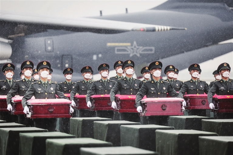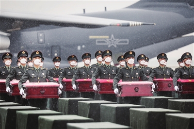 北京时间上午8时35分,中韩双方在韩国仁川国际机场举行志愿军烈士遗骸交接仪式。空军运-20专机于9时30分从韩国仁川机场起飞,进入中国领空后,两架歼-20为其护航,向英雄致敬。沈阳桃仙国际机场以“过水门”最高礼遇迎接志愿军烈士回家。