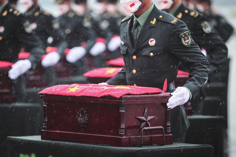 仪式现场庄严肃穆,《思念曲》奏响,礼兵护送着覆盖中华人民共和国国旗的志愿军烈士遗骸的棺椁,缓步来到棺椁摆放区。全体肃立,奏唱国歌,现场全体人员向烈士遗骸三鞠躬。
