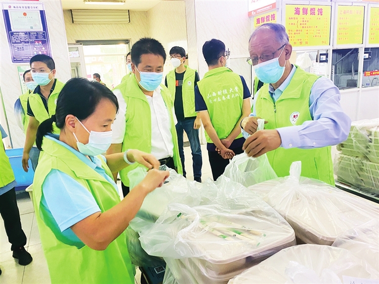 为了提高配送效率,将1.3万余份餐品准时准点送达学生手中,山西财大各学院迅速行动,各显神通。管理科学与工程学院成立了党员教师先锋突击队;经济学院组建了以37位教师为主力的“经院爱心联盟”。各个学院充分发挥党员先锋队、青年教师、辅导员等力量,全力保障学生生活需求。