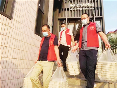 “为了保障在校生的正常生活,我们每天统一加工制作一日三餐,定时配送至学生公寓楼下,再由各学院的教职工志愿者分发给每位同学。”山西财经大学饮食中心负责人张卫民告诉记者:“我们尽可能地丰富菜品的种类,提供了包子、馒头、油条、盖饭、拌面等,保证同学们在宿舍也能吃到美味营养的饭菜。”