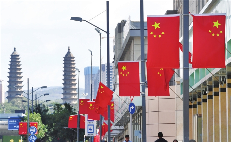 9月20日,省城街头鲜艳的五星红旗营造出浓浓的喜庆气氛,表达出太原人民欢欢喜喜迎国庆的喜悦心情。