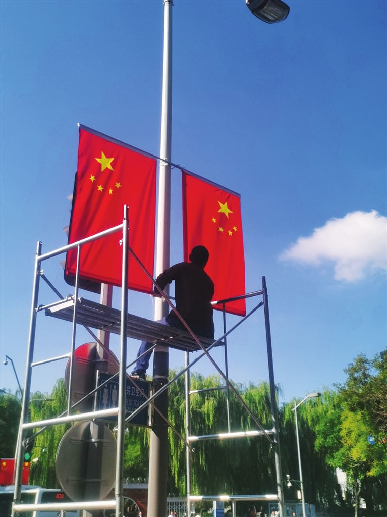 张琛介绍,9月16日起,杏花岭区开始在新建路、五一路、府东街、府西街、胜利街等辖区主干道两侧悬挂国旗,共计悬挂800多套、1600余面,如今工作进度已过半。对于灯杆附近没有绿化带的街道,可以使用脚手架在白天悬挂;若灯杆被安在绿化带中,则要使用升降车在夜晚悬挂,以减少对交通的影响。