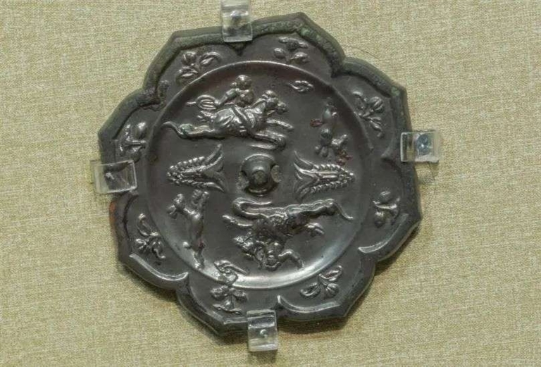 进入展区首先映入眼帘的唐代狩猎纹铜镜,就生动展现了当时人们骑马狩猎的场景。